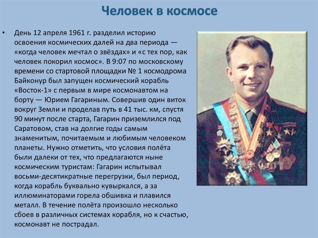 • Вслед за полётом Гагарина знаменательные вехи в историиосвоения космоса посыпались одна за другой: был совершён