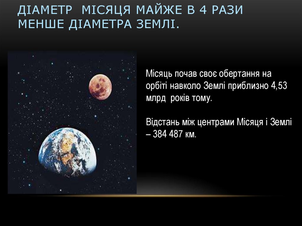 ДІАМЕТР МІСЯЦЯ МАЙЖЕ В 4 РАЗИМЕНШЕ ДІАМЕТРА ЗЕМЛІ.