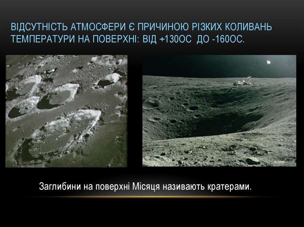 ВІДСУТНІСТЬ АТМОСФЕРИ Є ПРИЧИНОЮ РІЗКИХ КОЛИВАНЬТЕМПЕРАТУРИ НА ПОВЕРХНІ: ВІД +130ОС ДО -160ОС.