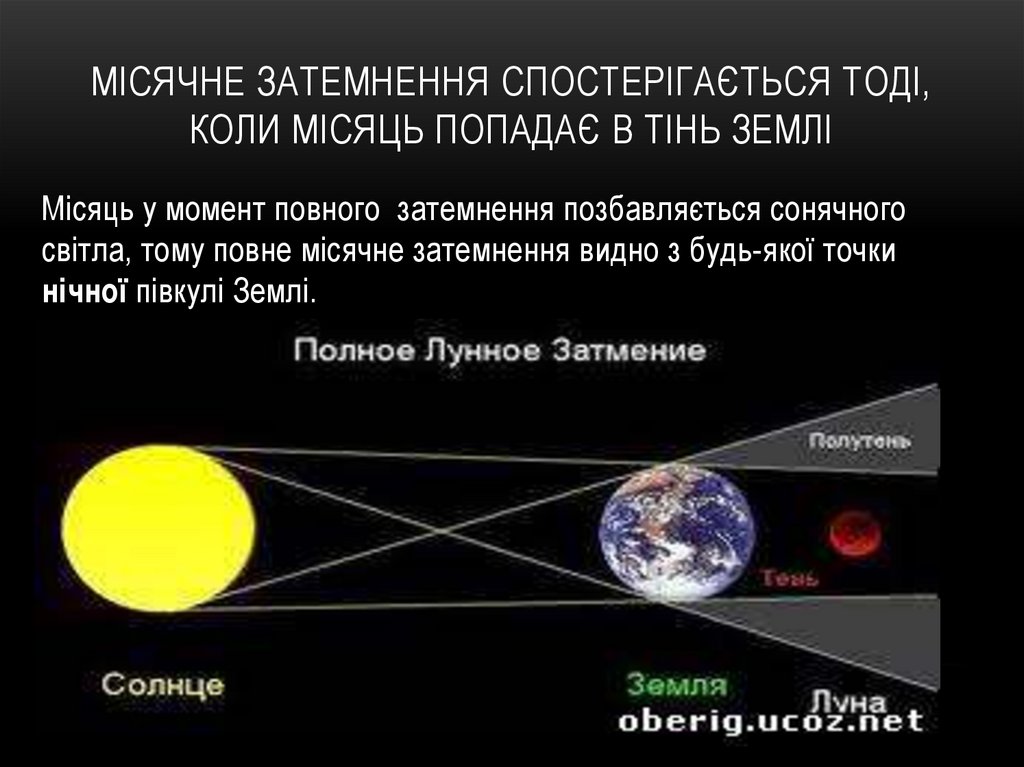МІСЯЧНЕ ЗАТЕМНЕННЯ СПОСТЕРІГАЄТЬСЯ ТОДІ,КОЛИ МІСЯЦЬ ПОПАДАЄ В ТІНЬ ЗЕМЛІ