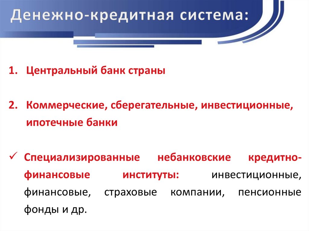 1. Центральный банк страны2. Коммерческие, сберегательные, инвестиционные,