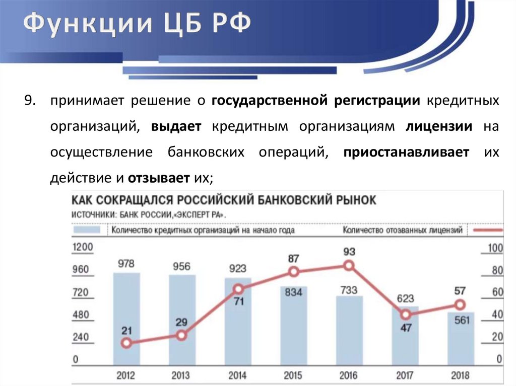 9. принимает решение о государственной регистрации кредитныхорганизаций, выдает кредитным организациям лицензии на