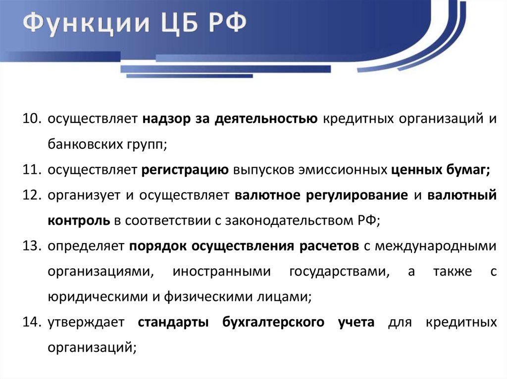 10. осуществляет надзор за деятельностью кредитных организаций ибанковских групп;