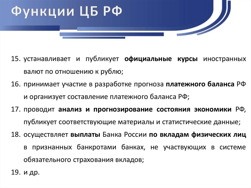 18. осуществляет выплаты Банка России по вкладам физических лиц