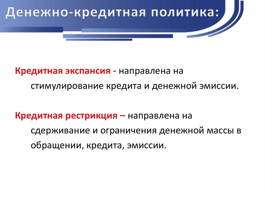 Кредитная экспансия - направлена настимулирование кредита и денежной эмиссии.