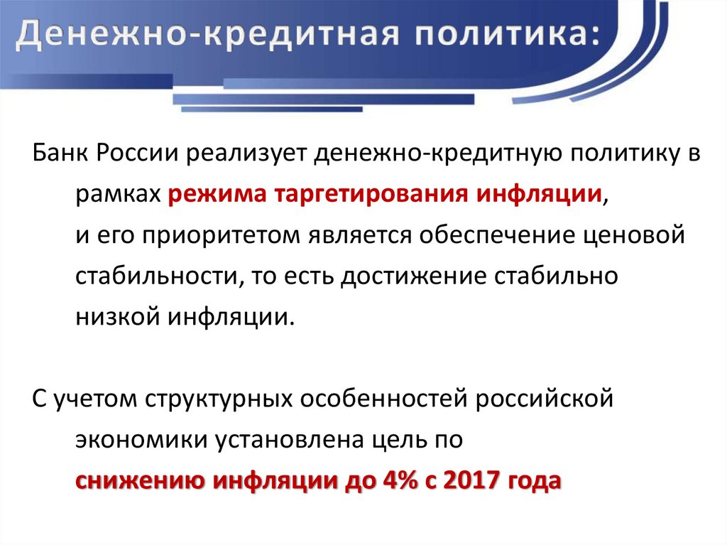 Банк России реализует денежно-кредитную политику врамках режима таргетирования инфляции,