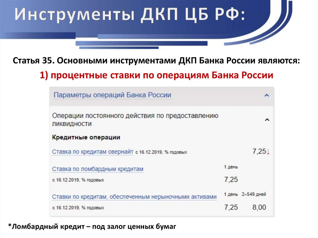 Статья 35. Основными инструментами ДКП Банка России являются:1) процентные ставки по операциям Банка России