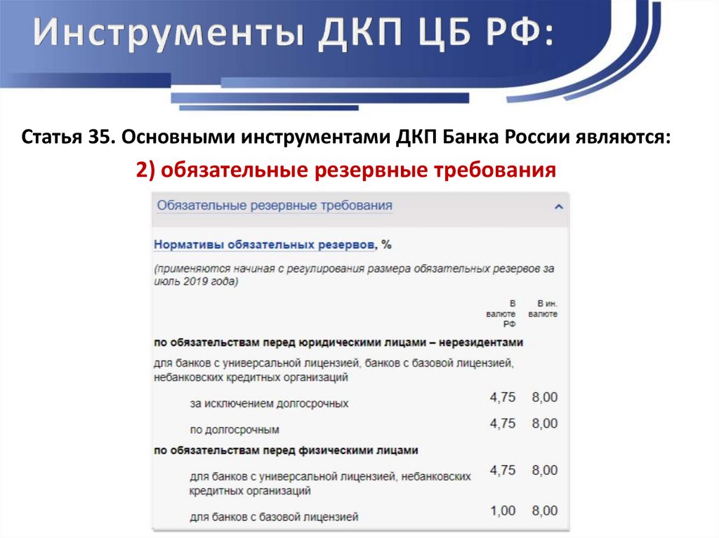 Статья 35. Основными инструментами ДКП Банка России являются:2) обязательные резервные требования