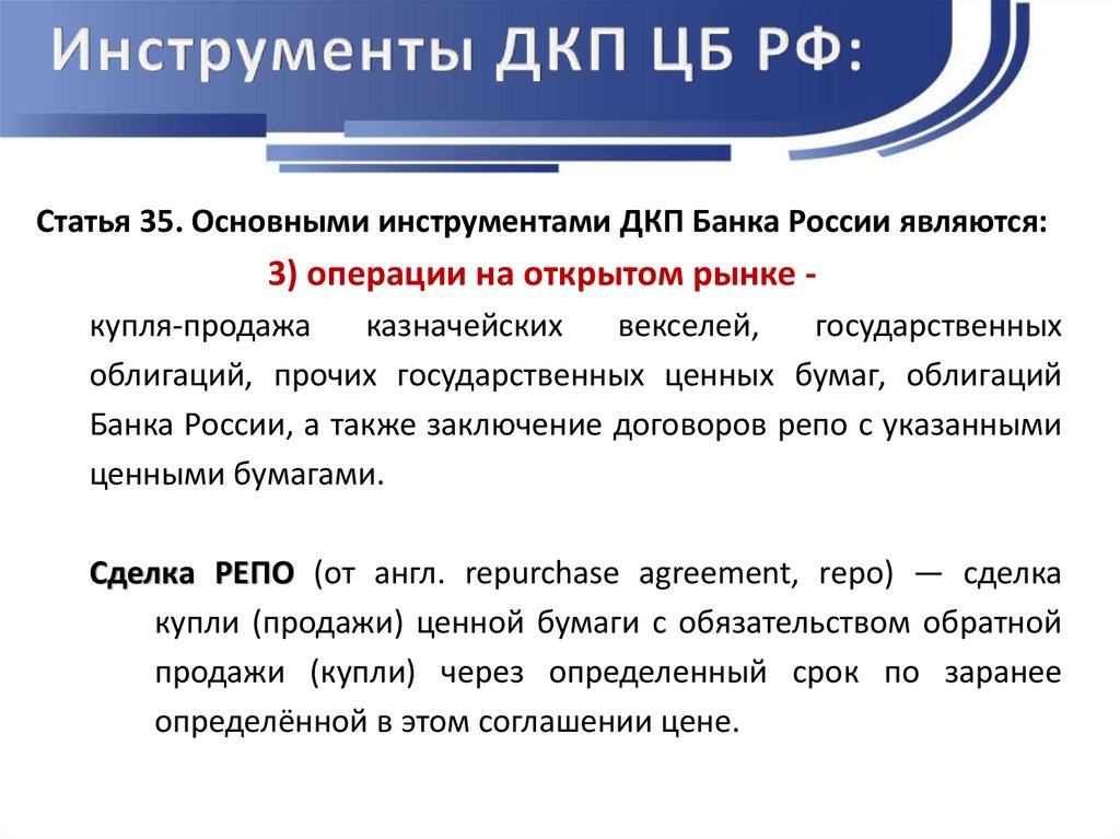 Статья 35. Основными инструментами ДКП Банка России являются:3) операции на открытом рынке купля-продажа