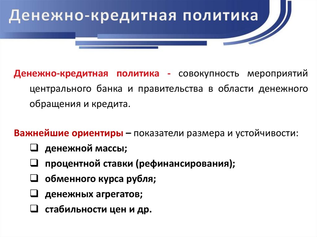 Денежно-кредитная политика - совокупность мероприятийцентрального банка и правительства в области денежного