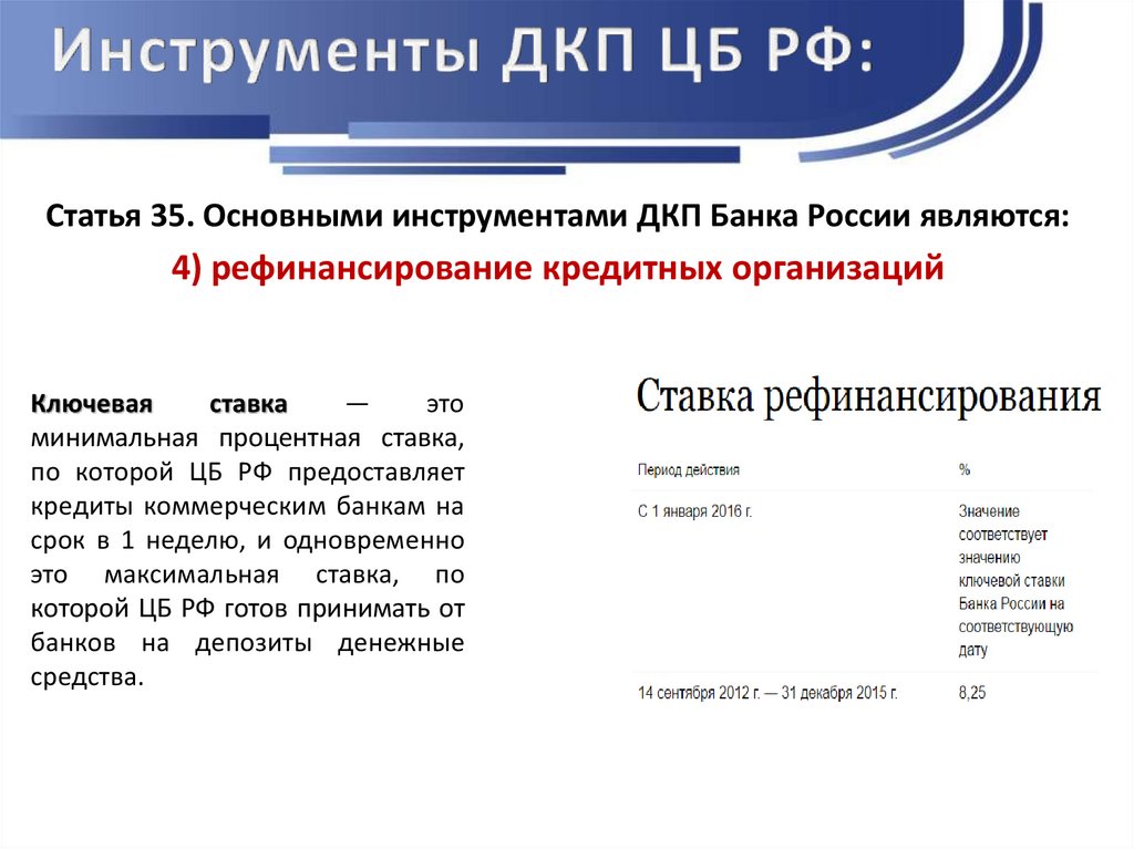 Статья 35. Основными инструментами ДКП Банка России являются:4) рефинансирование кредитных организаций