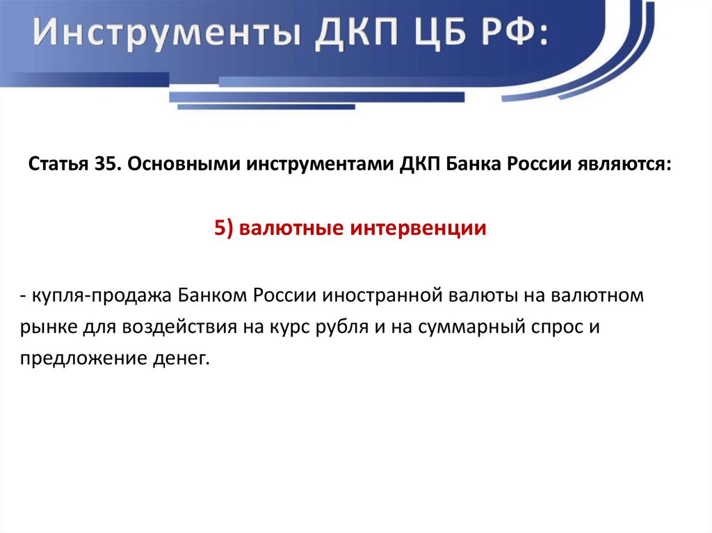 Статья 35. Основными инструментами ДКП Банка России являются:5) валютные интервенции