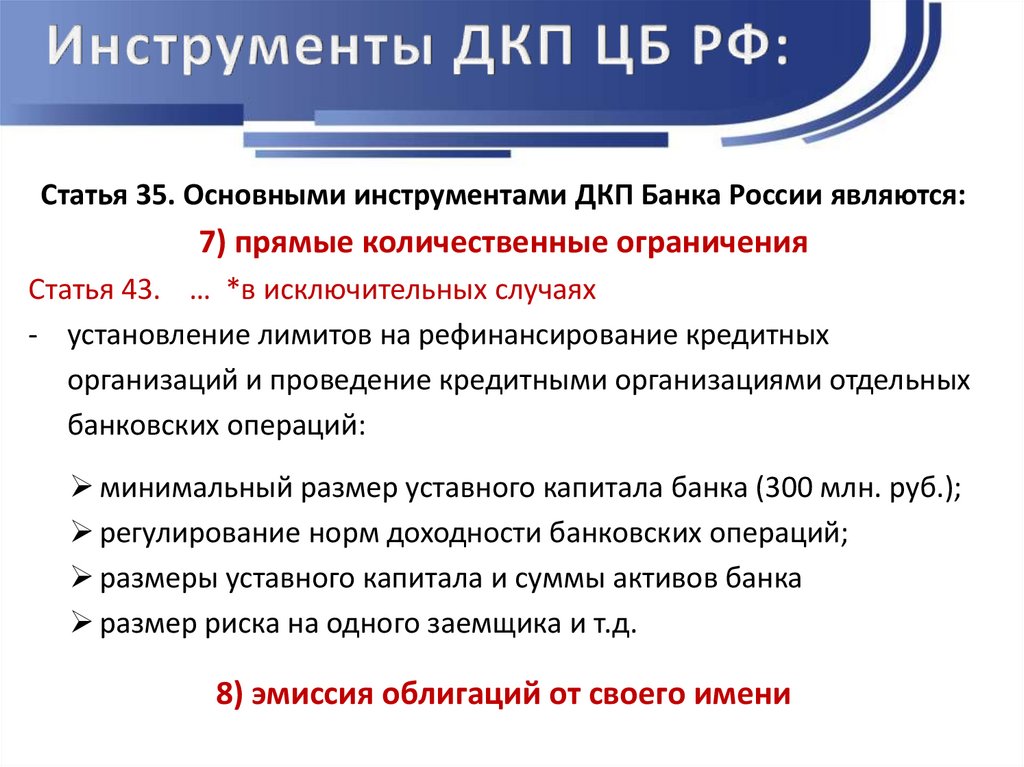 Статья 35. Основными инструментами ДКП Банка России являются:7) прямые количественные ограничения