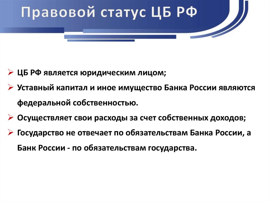 ЦБ РФ является юридическим лицом;Уставный капитал и иное имущество Банка России являются