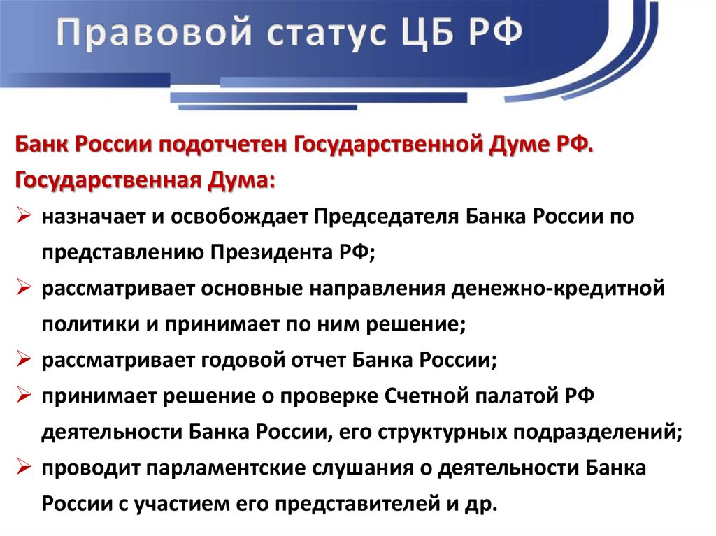 Банк России подотчетен Государственной Думе РФ.Государственная Дума: