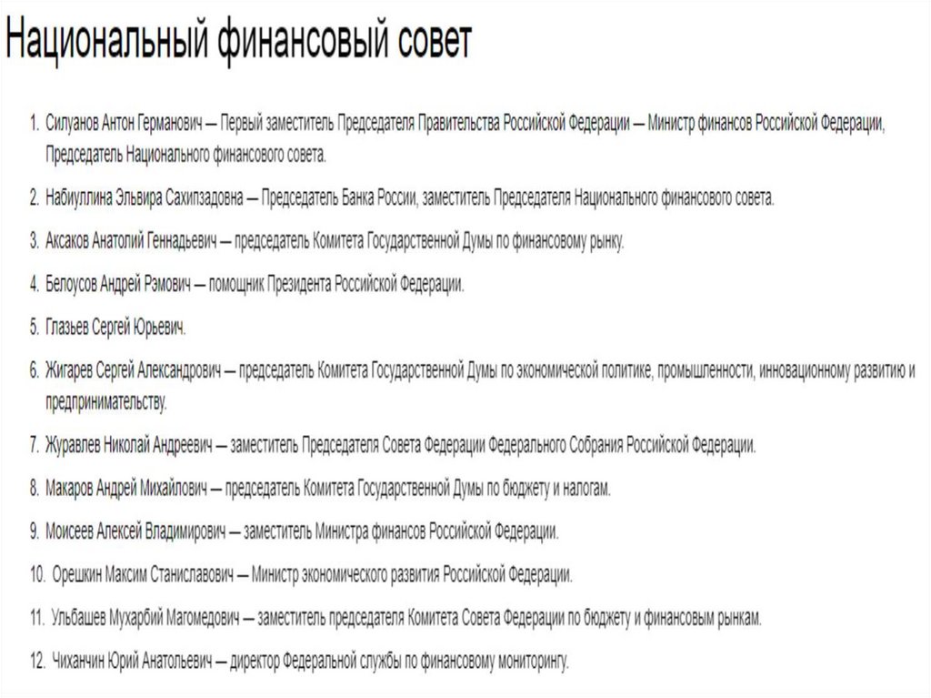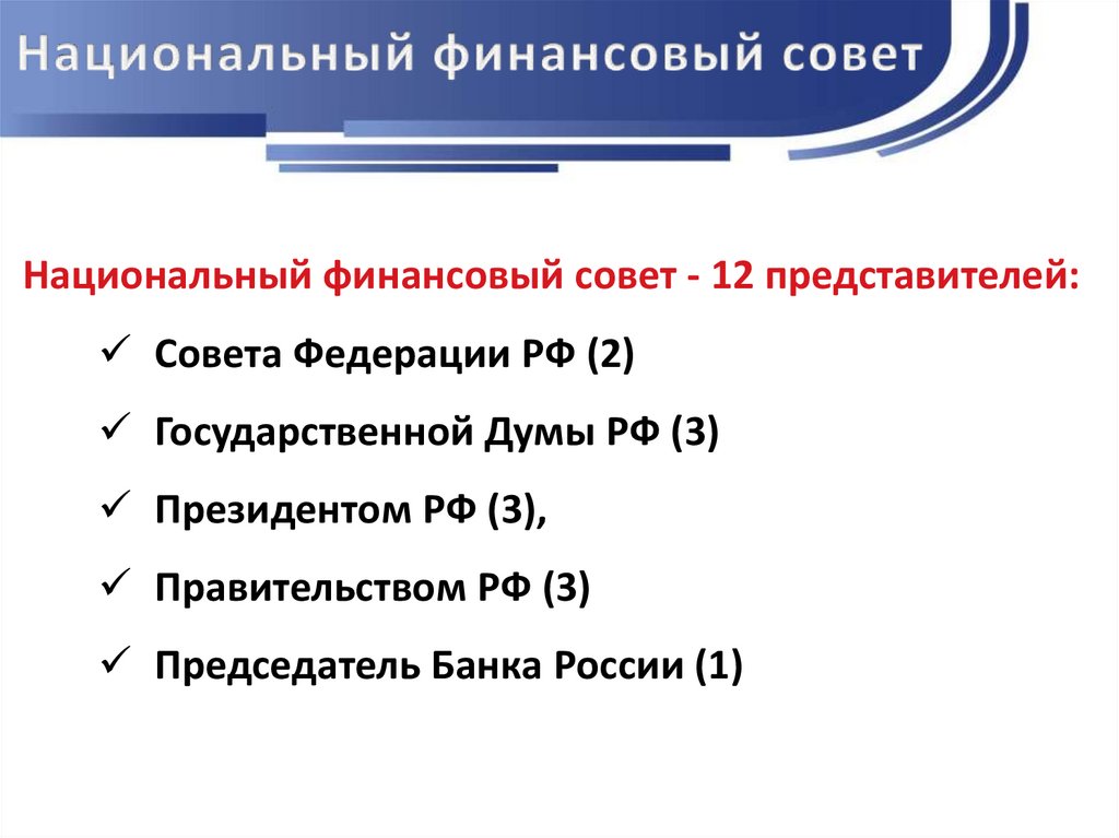 Национальный финансовый совет - 12 представителей:Совета Федерации РФ (2)