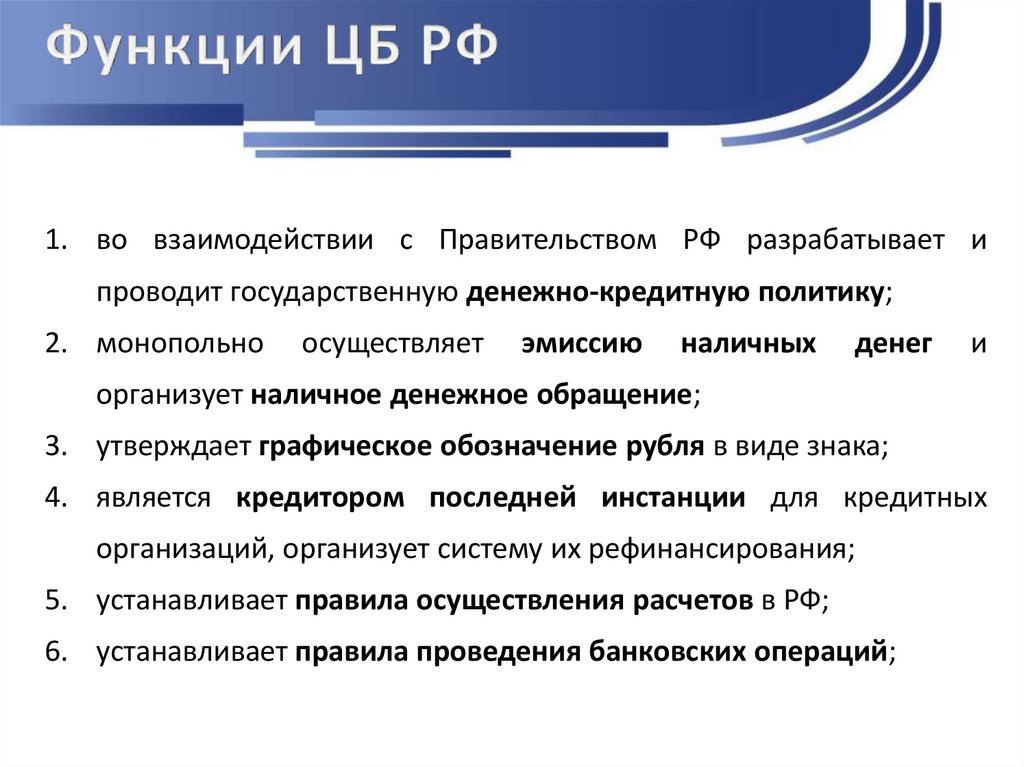 1. во взаимодействии с Правительством РФ разрабатывает ипроводит государственную денежно-кредитную политику;