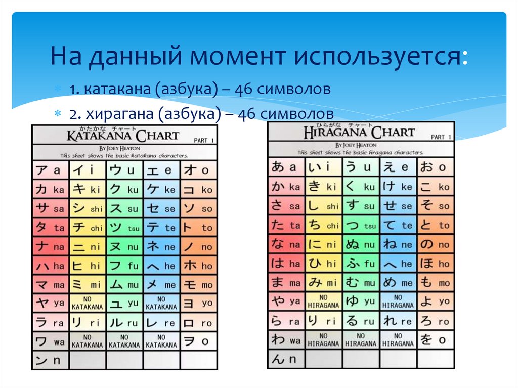 На данный момент используется:1. катакана (азбука) – 46 символов