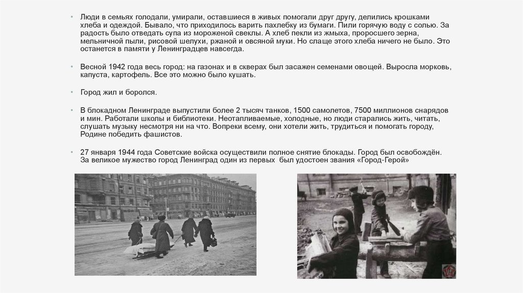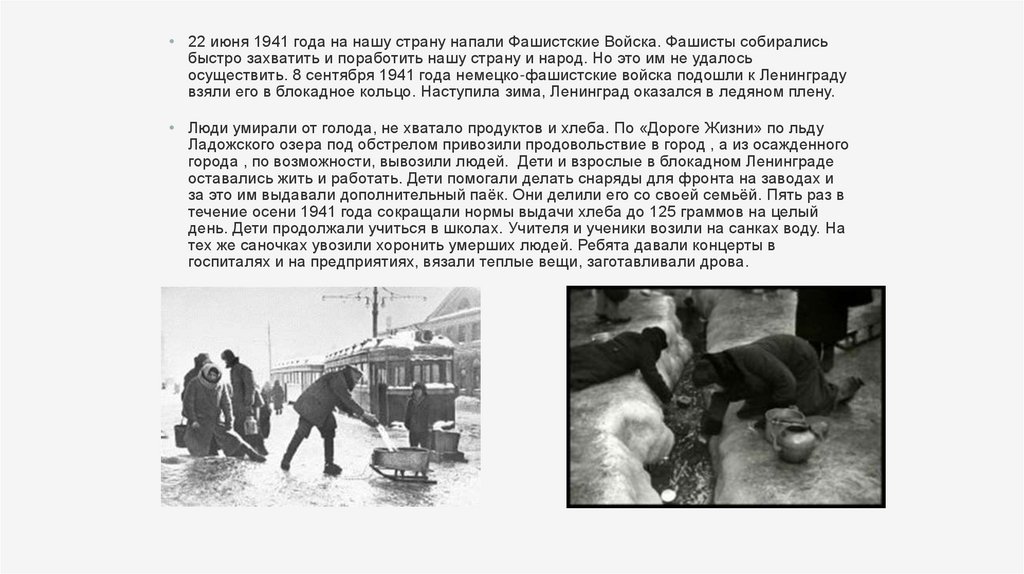 • Люди умирали от голода, не хватало продуктов и хлеба. По «Дороге Жизни» по льду