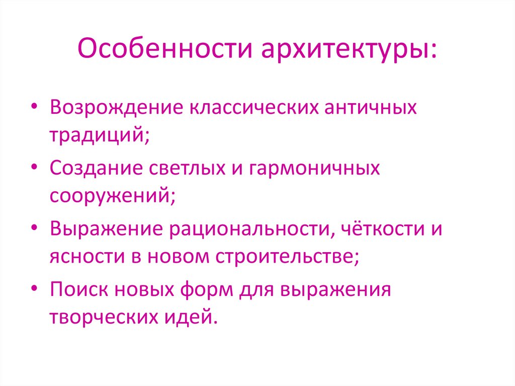 Особенности архитектуры:• Возрождение классических античных