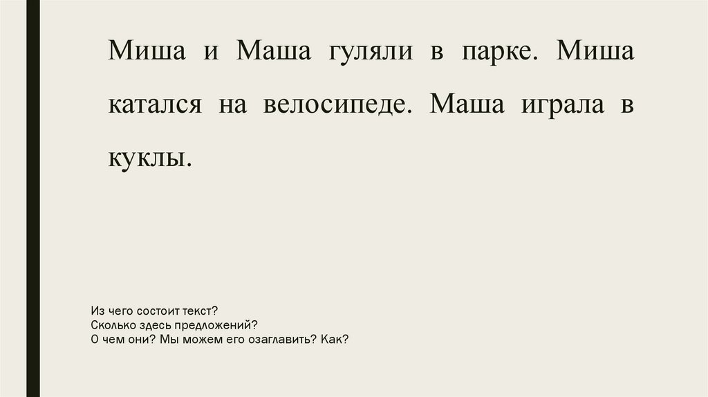 Миша и Маша гуляли в парке. Мишакатался на велосипеде. Маша играла в