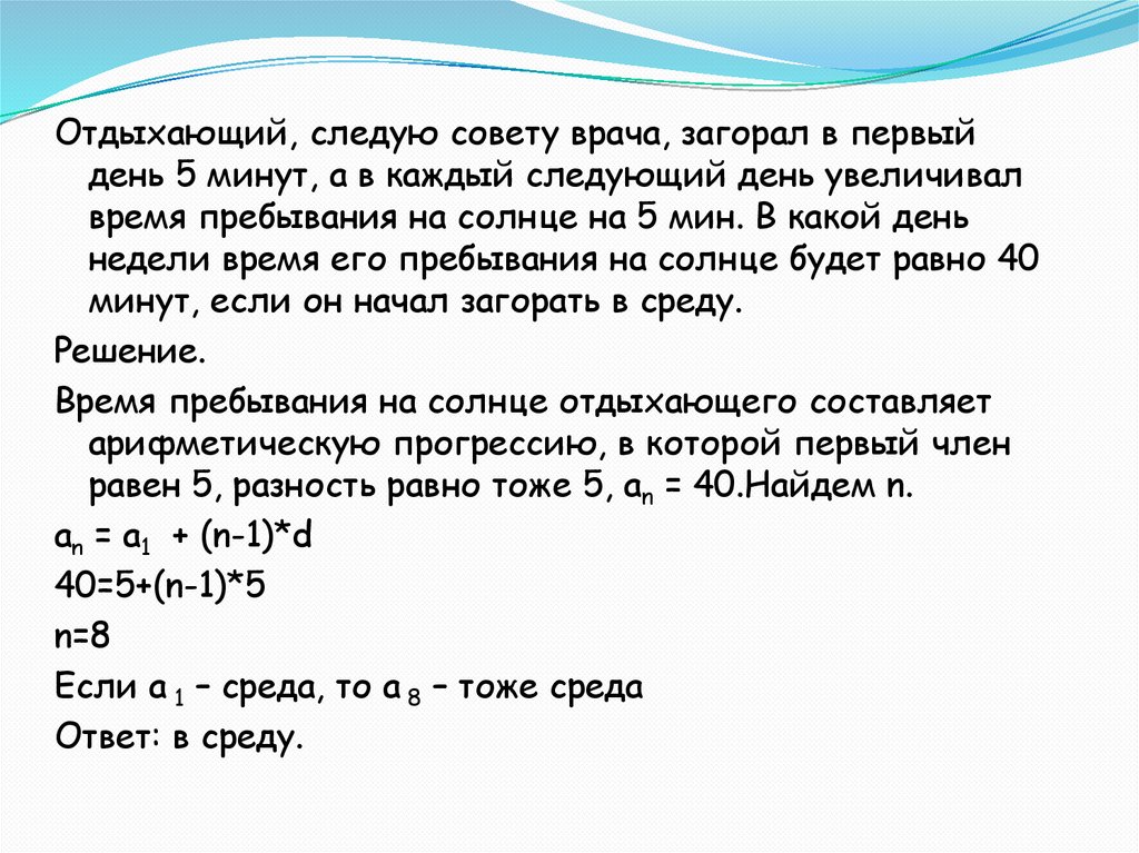 Отдыхающий, следую совету врача, загорал в первыйдень 5 минут, а в каждый следующий день увеличивал