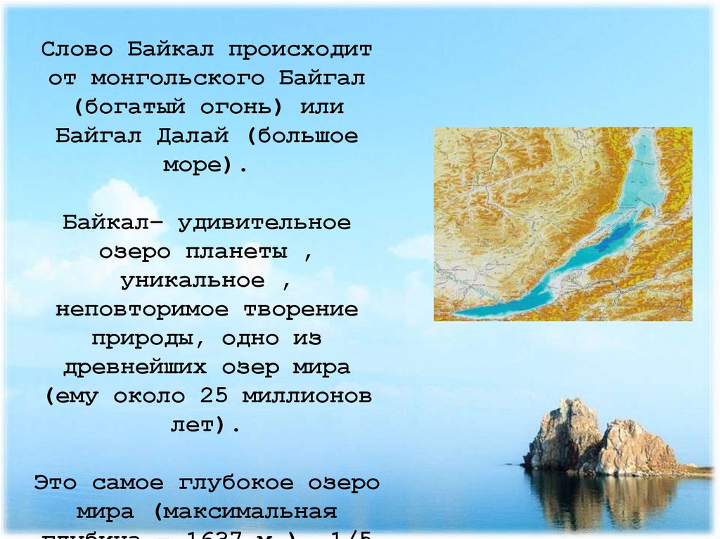 Слово Байкал происходитот монгольского Байгал