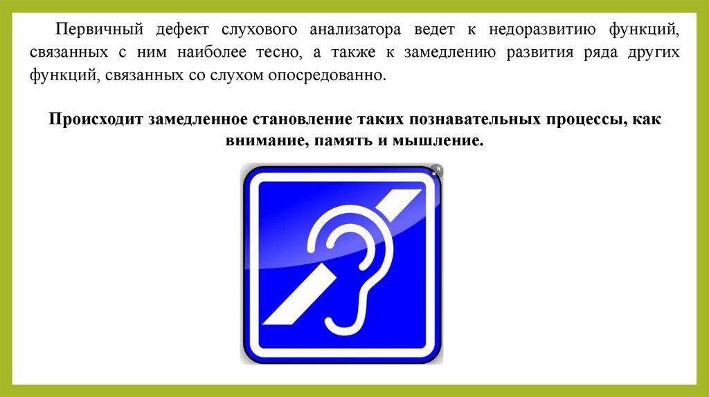 Первичный дефект слухового анализатора ведет к недоразвитию функций,связанных с ним наиболее тесно, а также к замедлению развития ряда других
