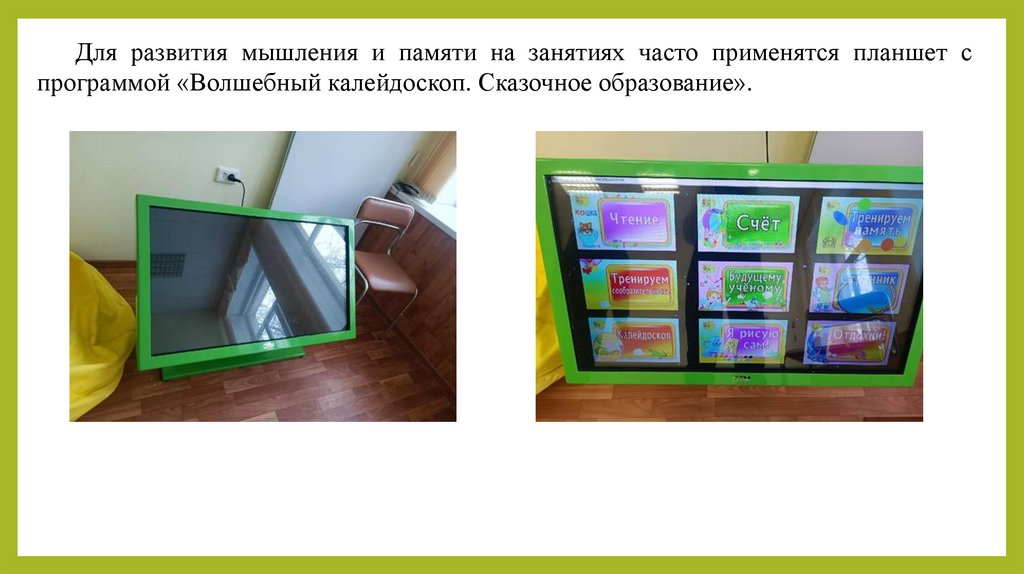Для развития мышления и памяти на занятиях часто применятся планшет спрограммой «Волшебный калейдоскоп. Сказочное образование».