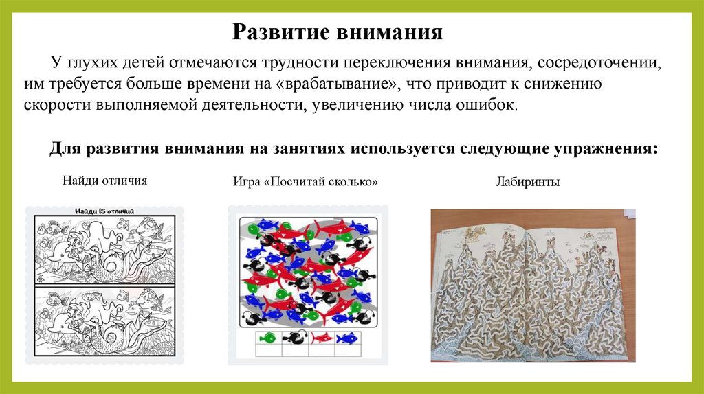 Развитие вниманияУ глухих детей отмечаются трудности переключения внимания, сосредоточении,