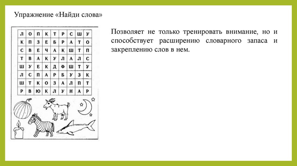 Упражнение «Найди слова»Позволяет не только тренировать внимание, но и