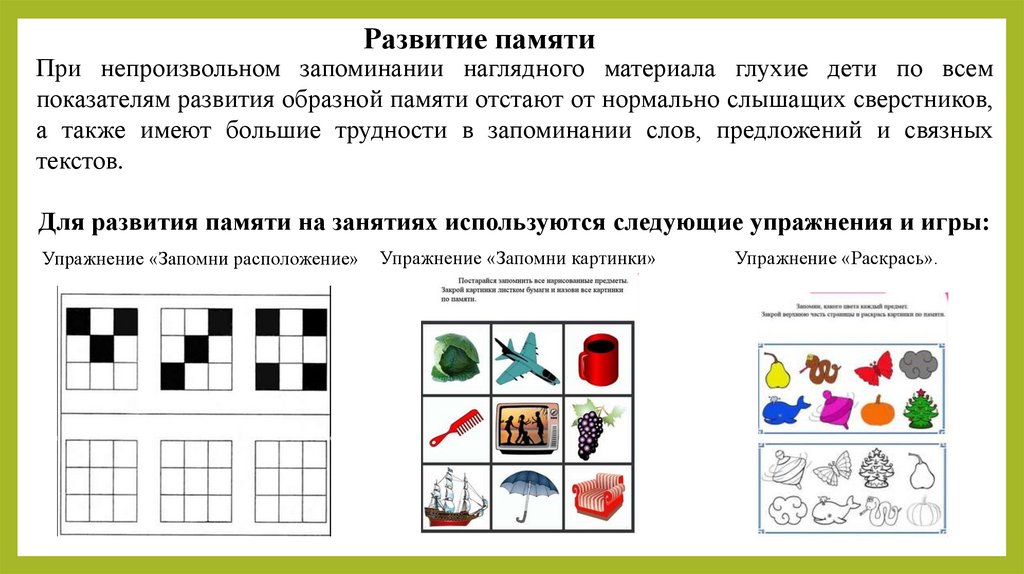 Для развития памяти на занятиях используются следующие упражнения и игры: