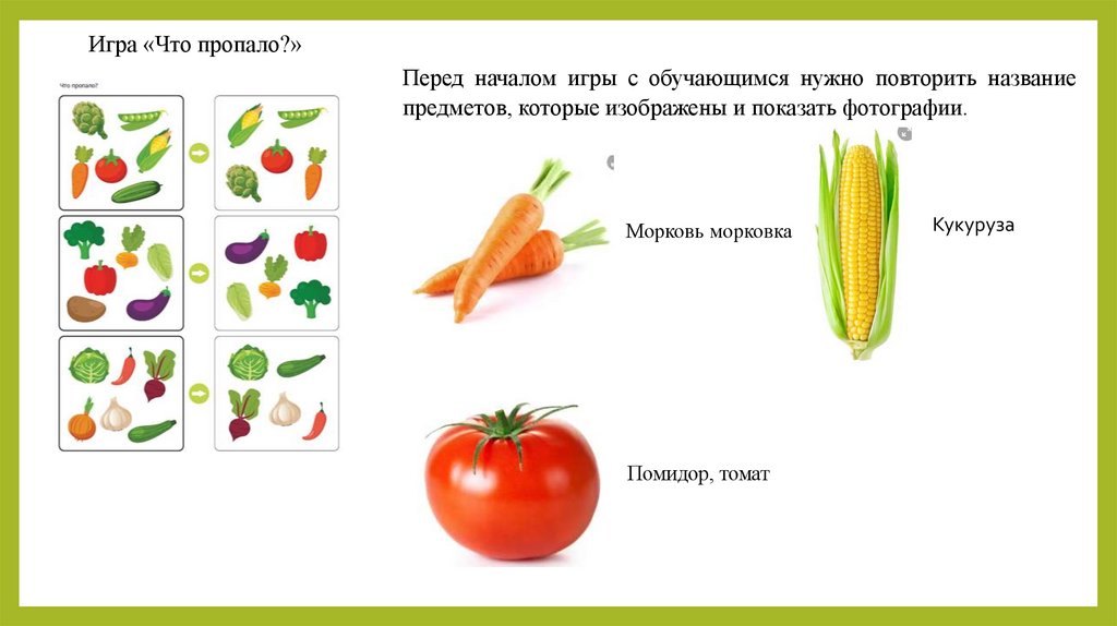 Игра «Что пропало?»Перед началом игры с обучающимся нужно повторить название