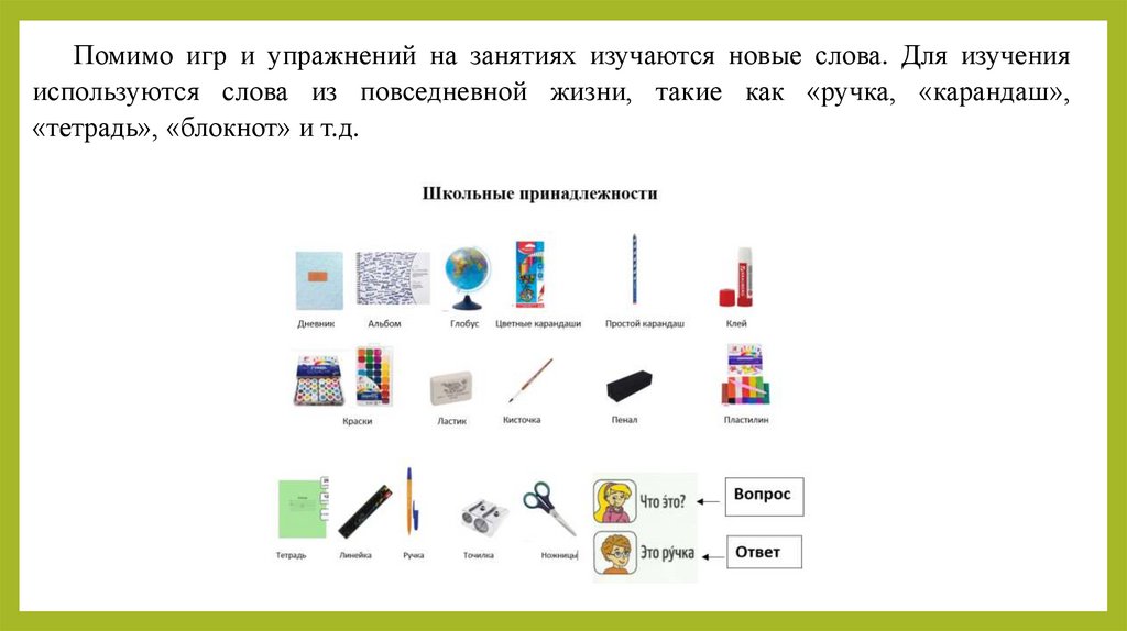 Помимо игр и упражнений на занятиях изучаются новые слова. Для изученияиспользуются слова из повседневной жизни, такие как «ручка, «карандаш»,