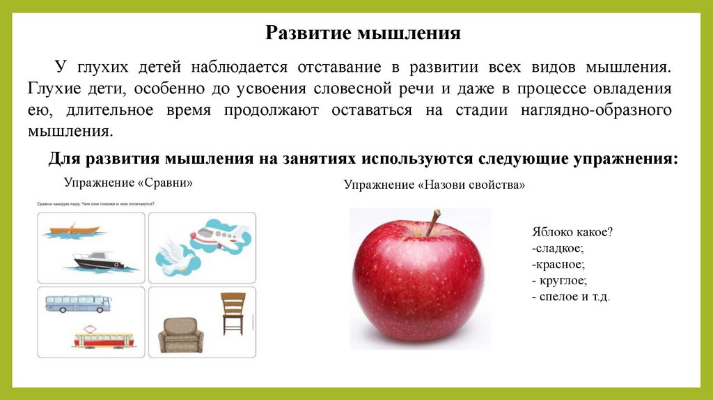 Развитие мышленияУ глухих детей наблюдается отставание в развитии всех видов мышления.