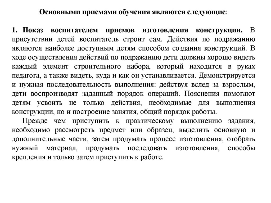 Основными приемами обучения являются следующие:1. Показ воспитателем приемов изготовления конструкции. В