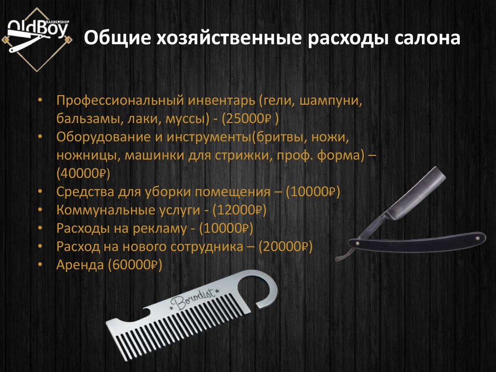 Общие хозяйственные расходы салона• Профессиональный инвентарь (гели, шампуни,