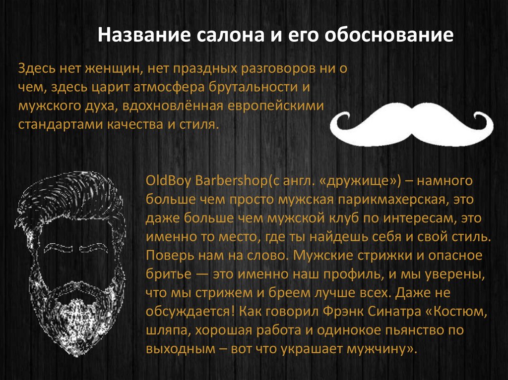Название салона и его обоснованиеЗдесь нет женщин, нет праздных разговоров ни о