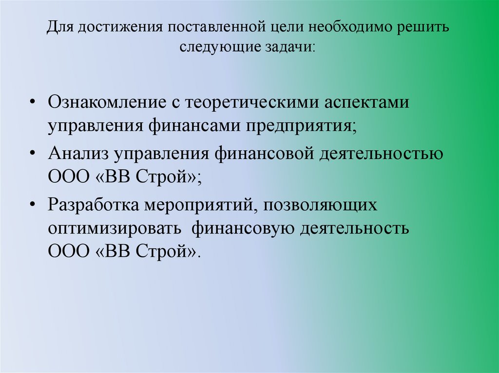 Для достижения поставленной цели необходимо решитьследующие задачи:
