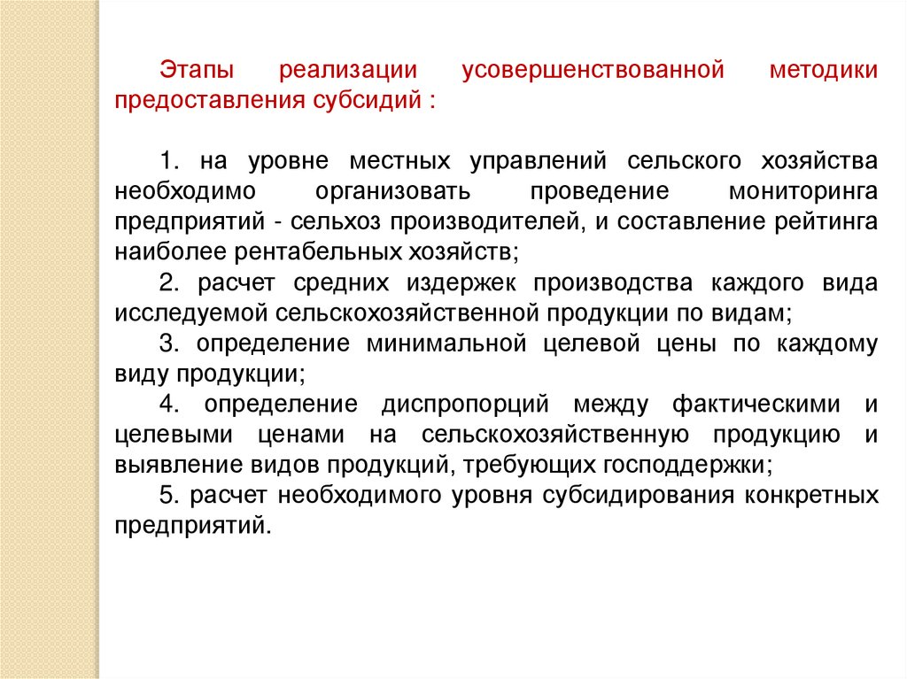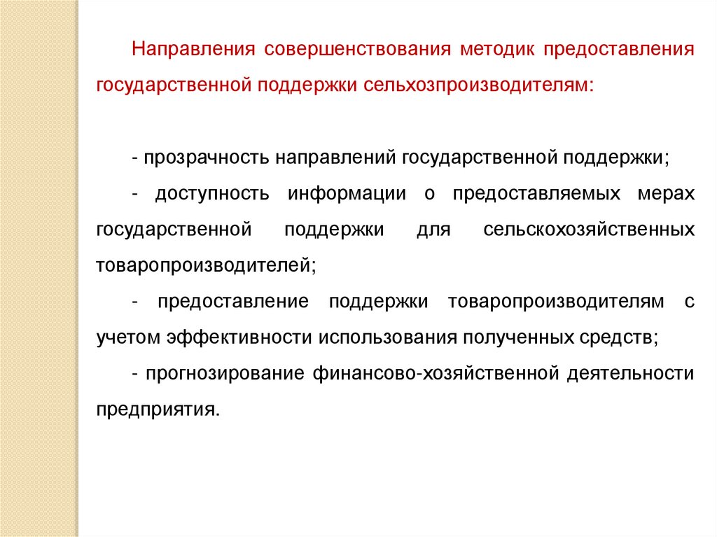 Направления совершенствования методик предоставлениягосударственной поддержки сельхозпроизводителям: