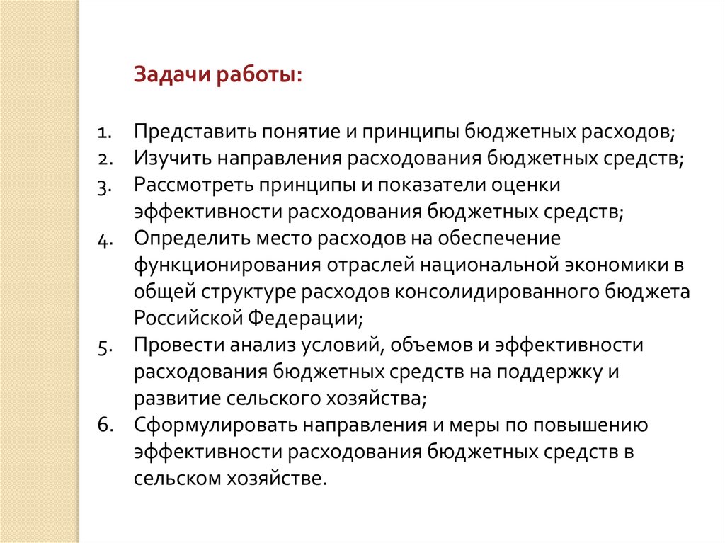 Задачи работы:1. Представить понятие и принципы бюджетных расходов;