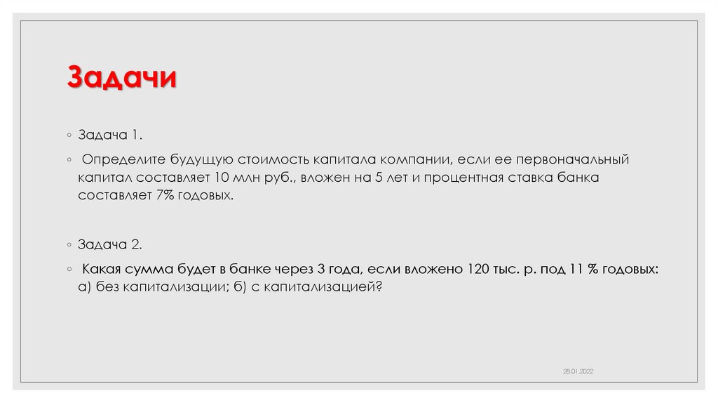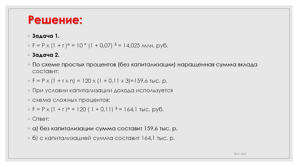 ◦ F = P х (1 + r )n = 120 ( 1 + 0,11) 3 = 164,1 тыс. руб.