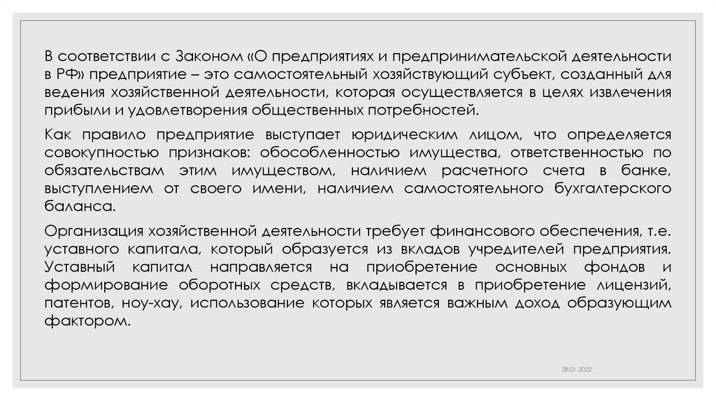 В соответствии с Законом «О предприятиях и предпринимательской деятельностив РФ» предприятие – это самостоятельный хозяйствующий субъект, созданный для