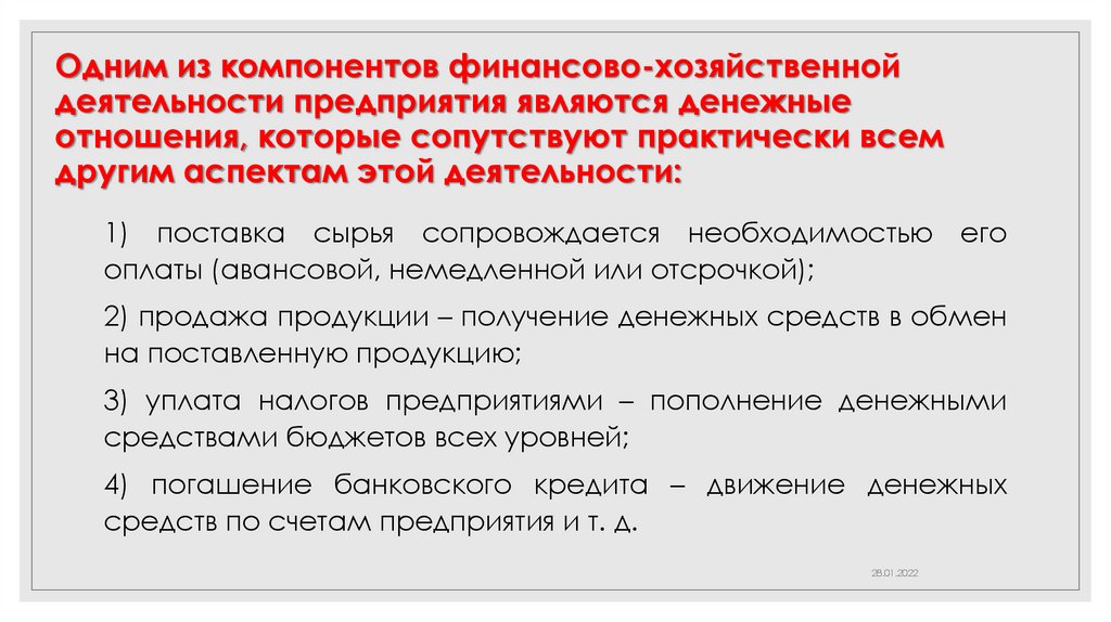 Одним из компонентов финансово-хозяйственнойдеятельности предприятия являются денежные