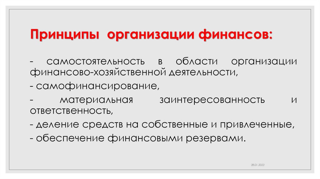 Принципы организации финансов:- самостоятельность в области организации