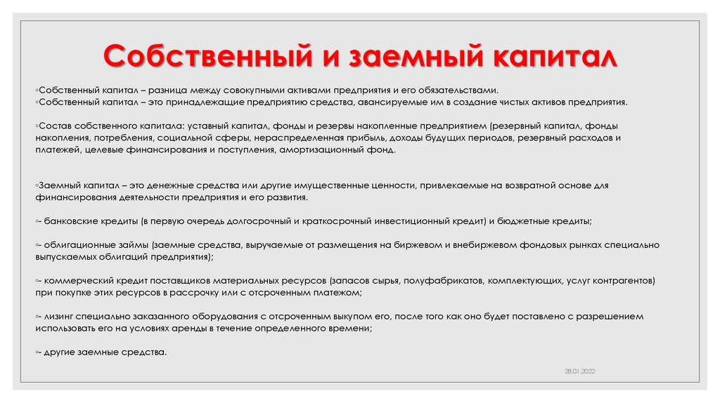 Собственный и заемный капитал◦Собственный капитал – разница между совокупными активами предприятия и его обязательствами.