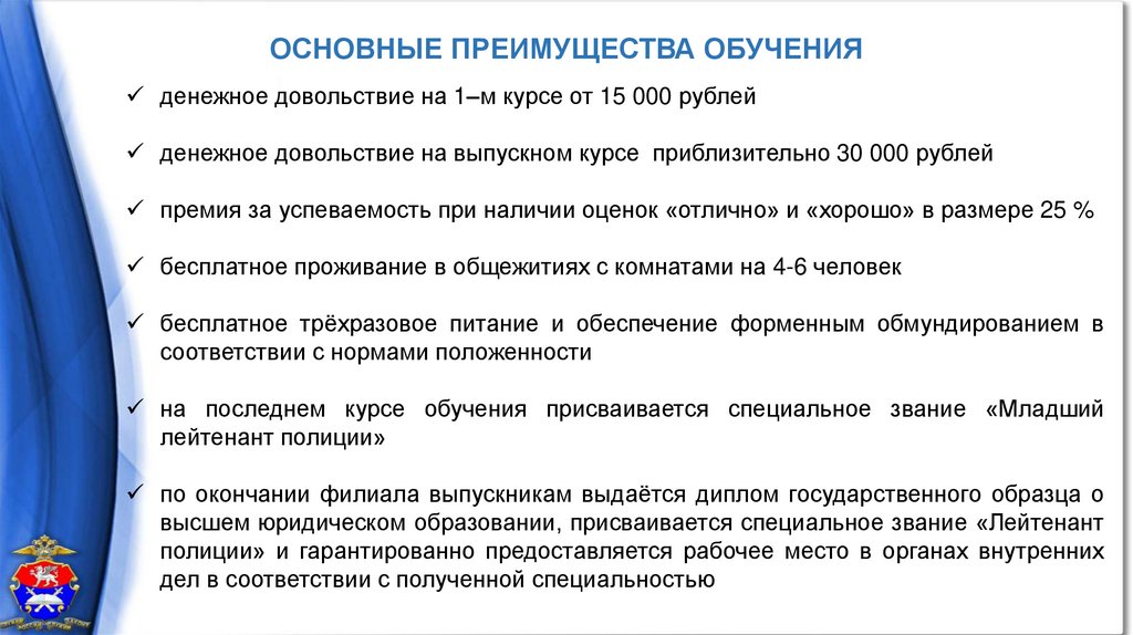 ОСНОВНЫЕ ПРЕИМУЩЕСТВА ОБУЧЕНИЯденежное довольствие на 1–м курсе от 15 000 рублей