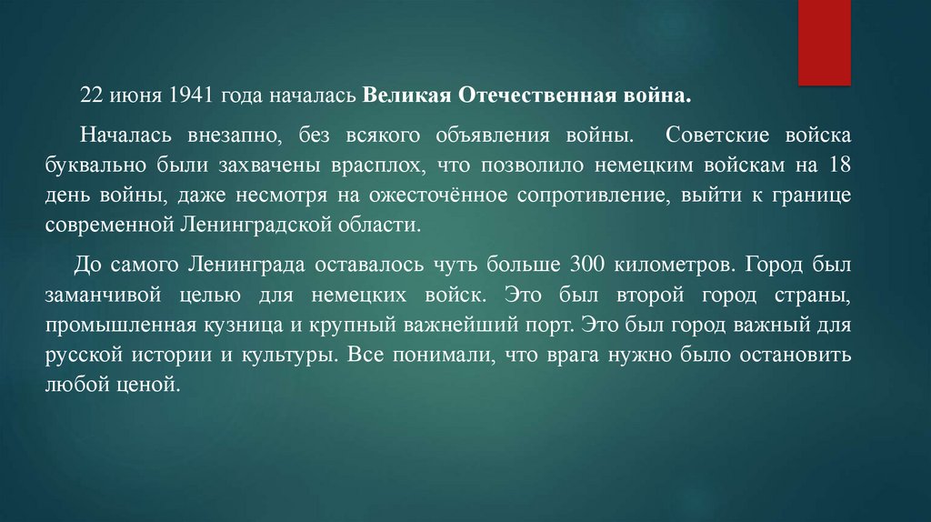 22 июня 1941 года началась Великая Отечественная война.Началась внезапно, без всякого объявления войны. Советские войска