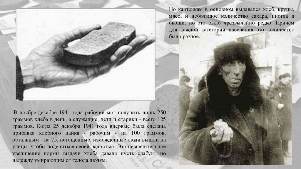 граммов хлеба в день, а служащие, дети и старики - всего 125