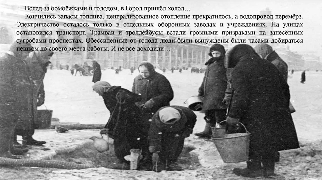 Вслед за бомбёжками и голодом, в Город пришёл холод…Кончились запасы топлива, централизованное отопление прекратилось, а водопровод перемёрз.